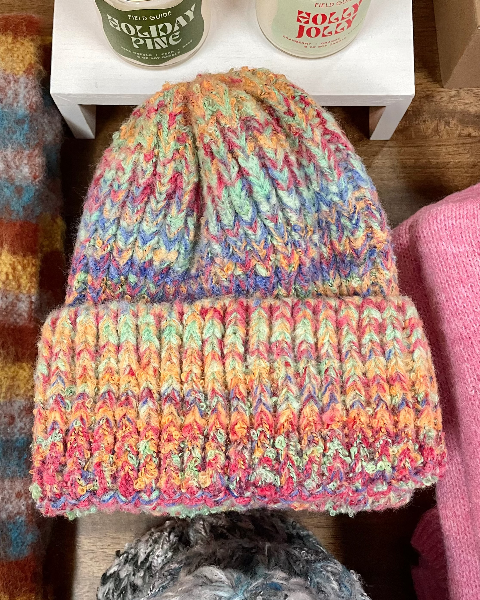 Chunky knit construction featuring a colorful contrast gradient.