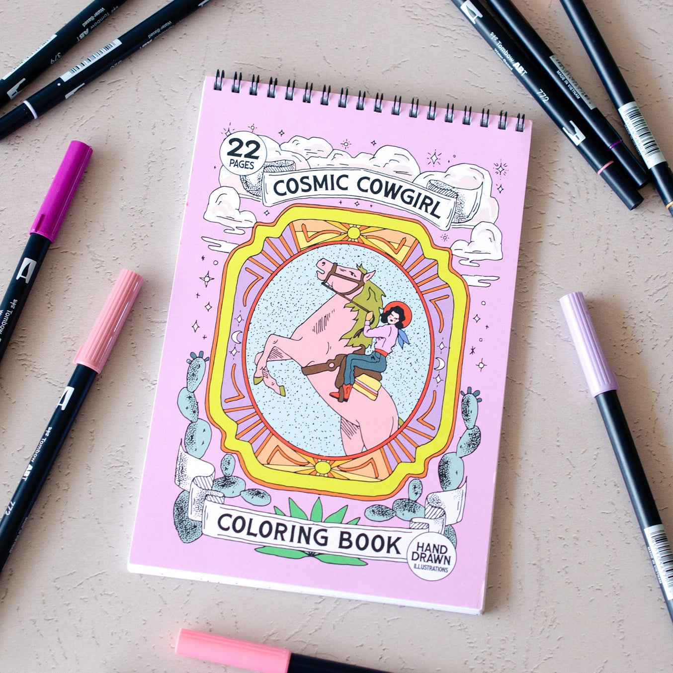 This unique coloring book, proudly made in the USA and printed on premium coloring paper, features 22 pages filled with 11 imaginative illustrations of bold western landscapes and cosmic cowgirls, with 2 copies of each design. Perfect for adults and children alike, or for sharing with a friend, these fun and engaging pages are designed to fit effortlessly into your busy schedule.