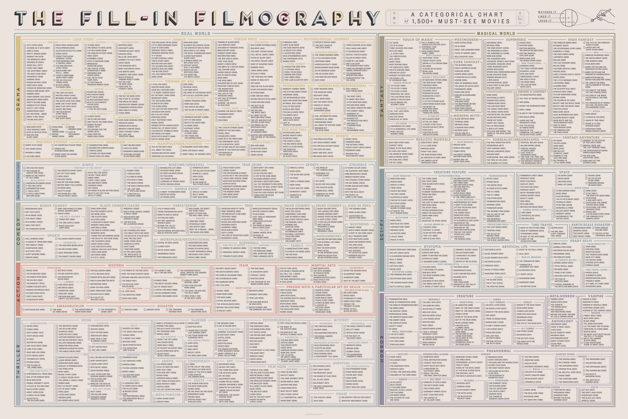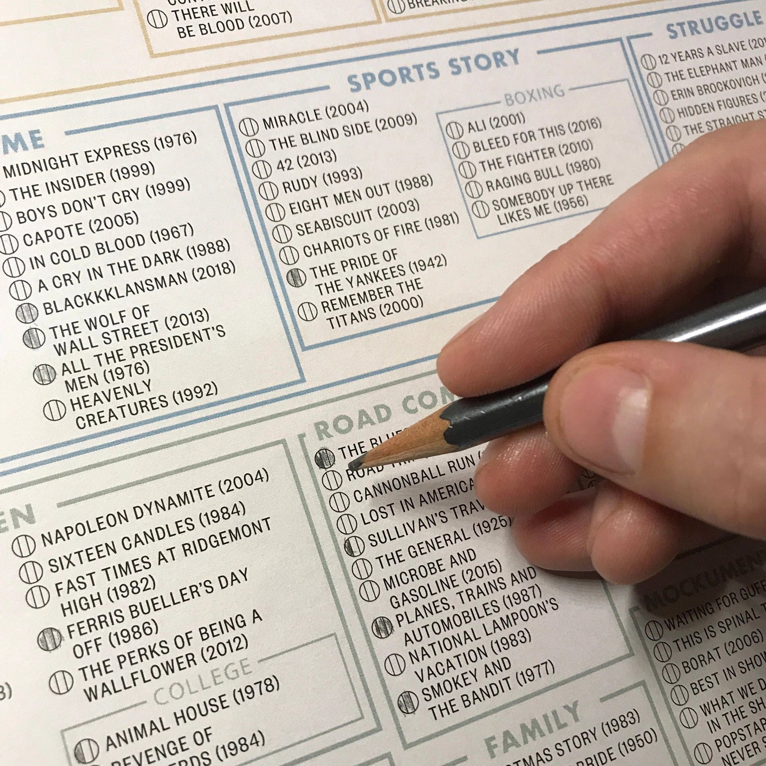 A massive mapping of cinematic genres (with representative movies for each category), this big-screen behemoth is fully customizable to reflect your personal tastes—just grab a pencil and fill in the circle next to each film to mark it as “Loved It,” “Liked It,” or merely “Watched It”! Whether your prefer Period Pieces, Musicals, or tales of Haunted Dolls, there’s something here for cinephiles of every sort.