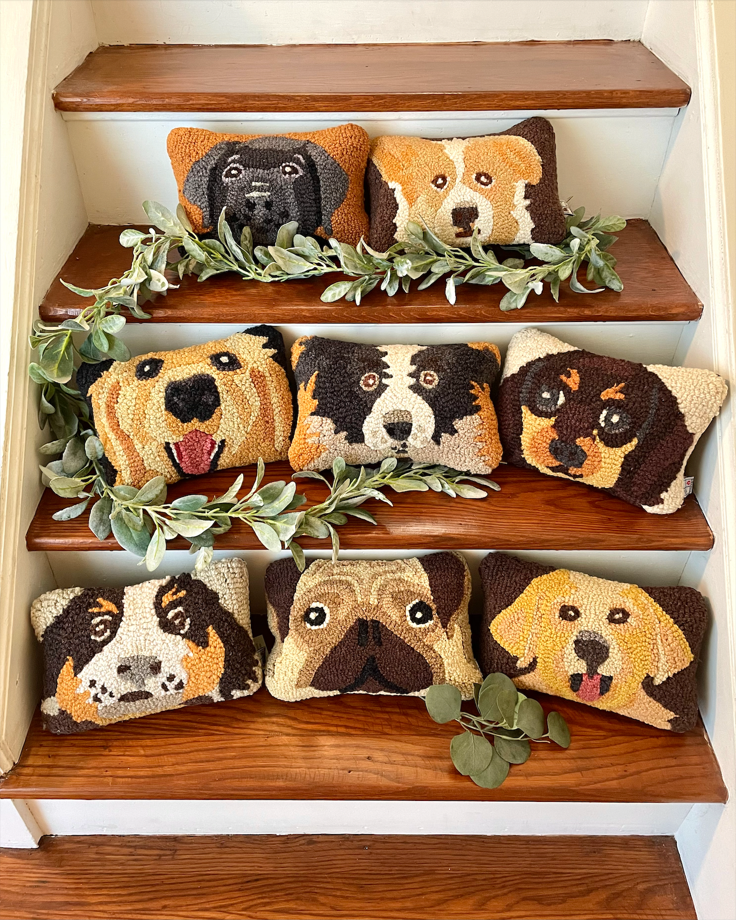 8" x 12" hand hooked pillow, made with 100% natural wool. Zippered velveteen backing with poly-fill pillow insert.
